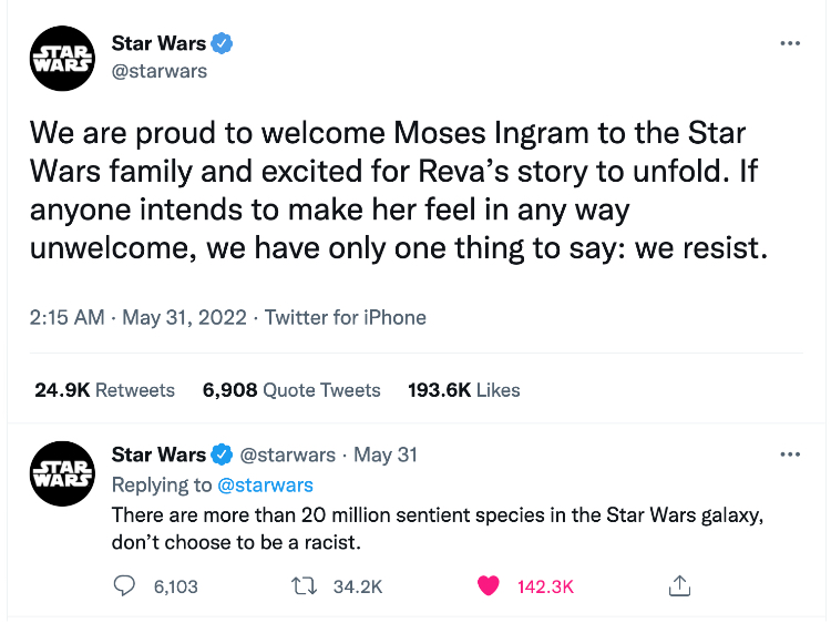 It's been pointed out to me that a corner of the Star Wars fandom takes offense at these tweets, claiming that these are bashing all fans. I've seen it being spread that Lucasfilm is saying all legitimate non-racist criticism of the OBK show itself is really racially motivated. Lucasfilm hasn't actually addressed any criticisms of the show that I have seen. I am a part of all fans. I am not in the slightest bit offended by these tweets, and the reason is simply that these statements are clearly not directed to all fans. The main tweet clearly indicates it is only directed towards anyone making the actor "feel in any way unwelcome," which is an extremely gentle euphemism for the vile hate speech she has been subjected to. The second one effectively advises to not choose to be racist. That is clearly directed only at those who choose racism. If you aren't a racist Star Wars fan, then these tweets do not apply to you. If you take offense to these statements, that says a lot more about you than Disney and Lucasfilm. If you feel you are not racist but get called a racist a lot in your life so this is a sensitive topic for you, then maybe you should take a good look in the mirror and examine why that keeps happening to you. And if media outlets are running with stories about how toxic all Star Wars supposedly are, they are just as prejudice as the haters. Not all fans are toxic, and Lucasfilm is not responsible for others warping the facts of their statements.